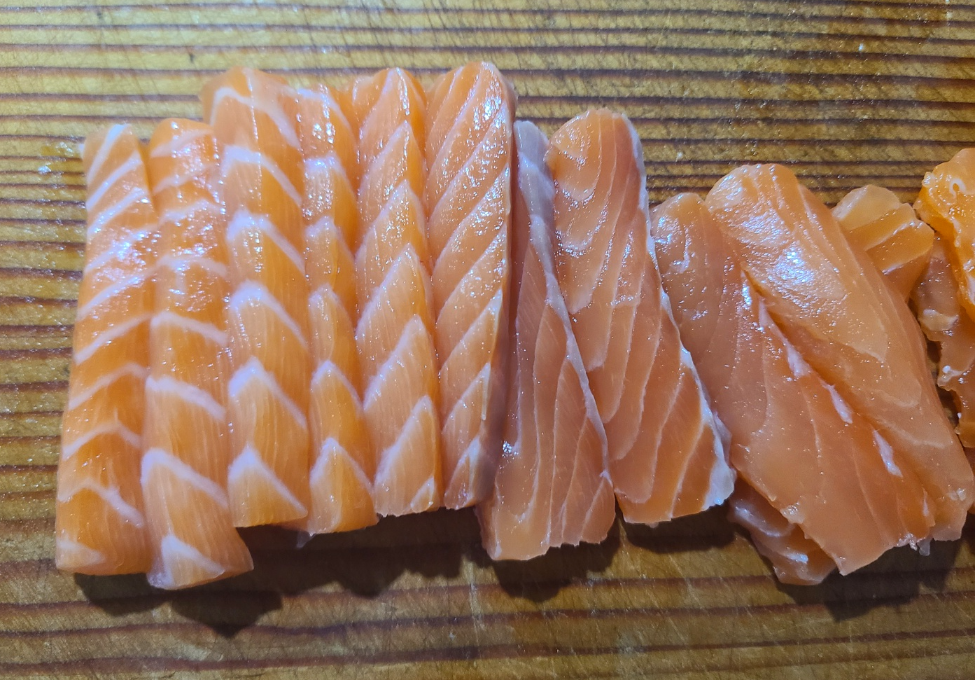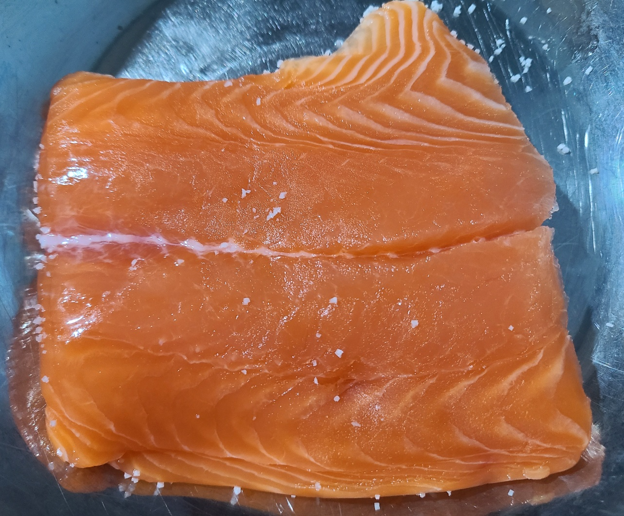 뒤집에서 연어를 잘라줍니다.